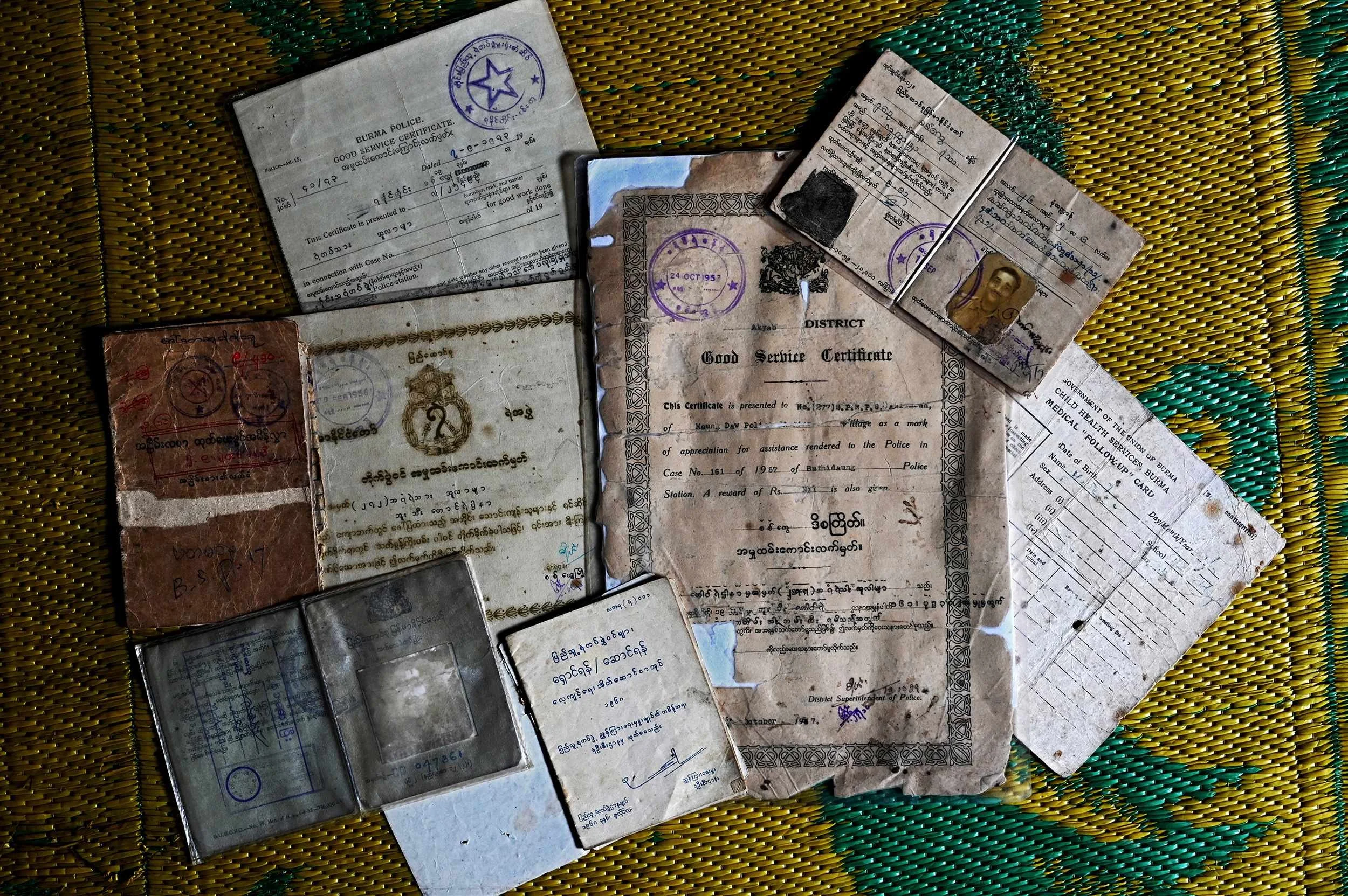 Salai Ahmed (center) was appointed a village headman in 1949. He passed away in the late 1980s. Included here are: original National Registration Cards of Salai Ahmed, his brother and son and their wives, a Family list issued in 1959 and Appointment of Headman issued in 1949. Also two voter registration cards issued in 1978 and 1981 by the electoral commission.
